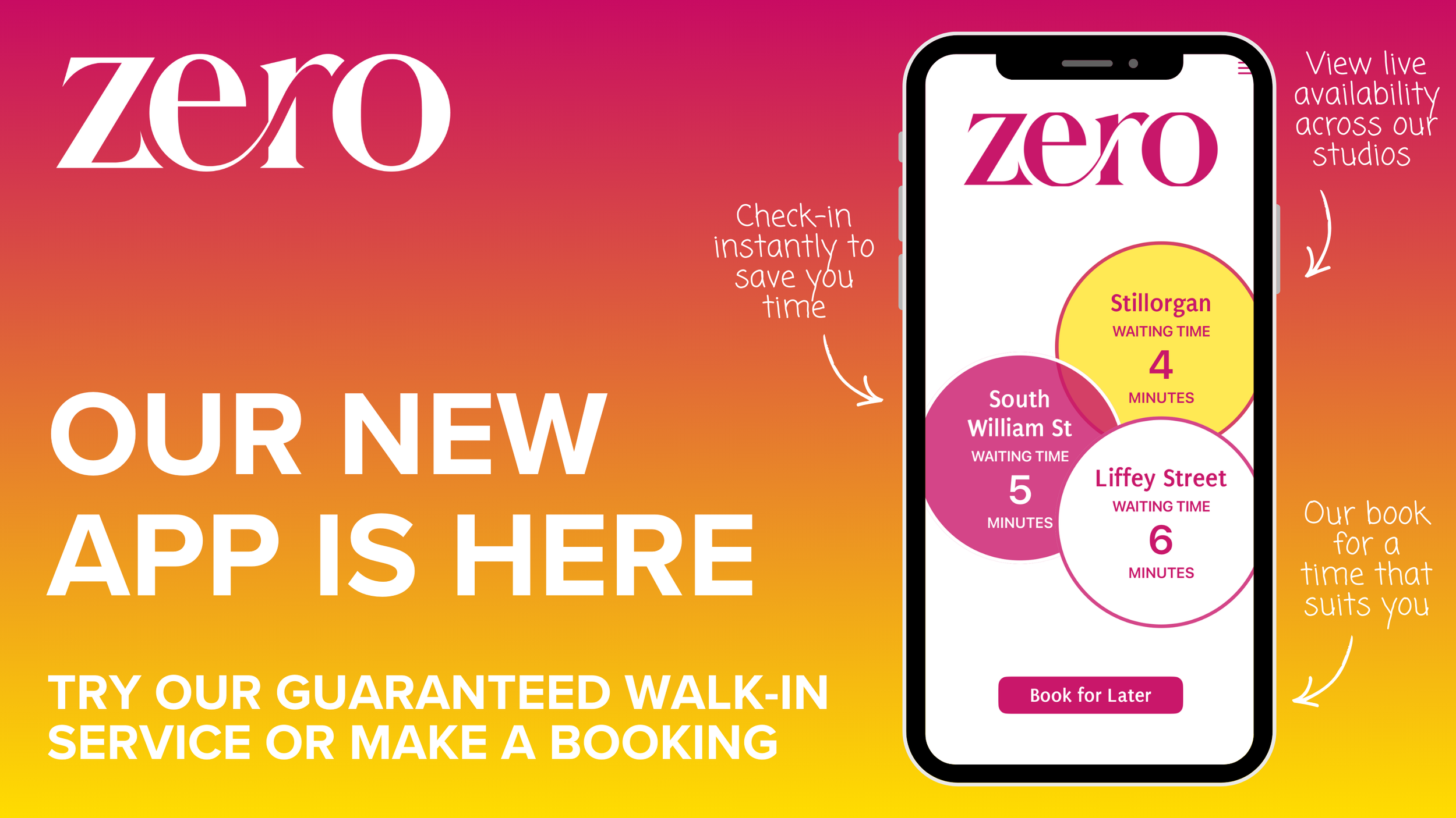 No appointment? No problem. With Zero’s intuitive app and Guaranteed Same-Day Service, you can check in for your treatment today, straight from your phone. View real-time availability across all three Dublin studios and secure your spot instantly. Whether you're in a rush or just decided last minute, our app puts you in control. Fast, flexible, and guaranteed.